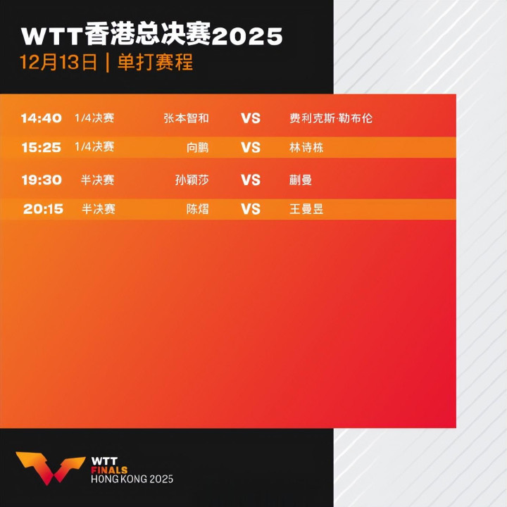 北京时间12月13日消息,2025年WTT香港总决赛继续进行,CCTV5、CCTV5+直播比赛实况。其中,女子单打半决赛将上演两场中国德比战,孙颖莎对阵蒯曼(19:30),王曼昱迎战陈熠(20:15)。此前哈将继续两场男单1/4决赛的争夺,林诗栋对阵向鹏(15:25)、张本智和对阵小勒布伦(14:40)。